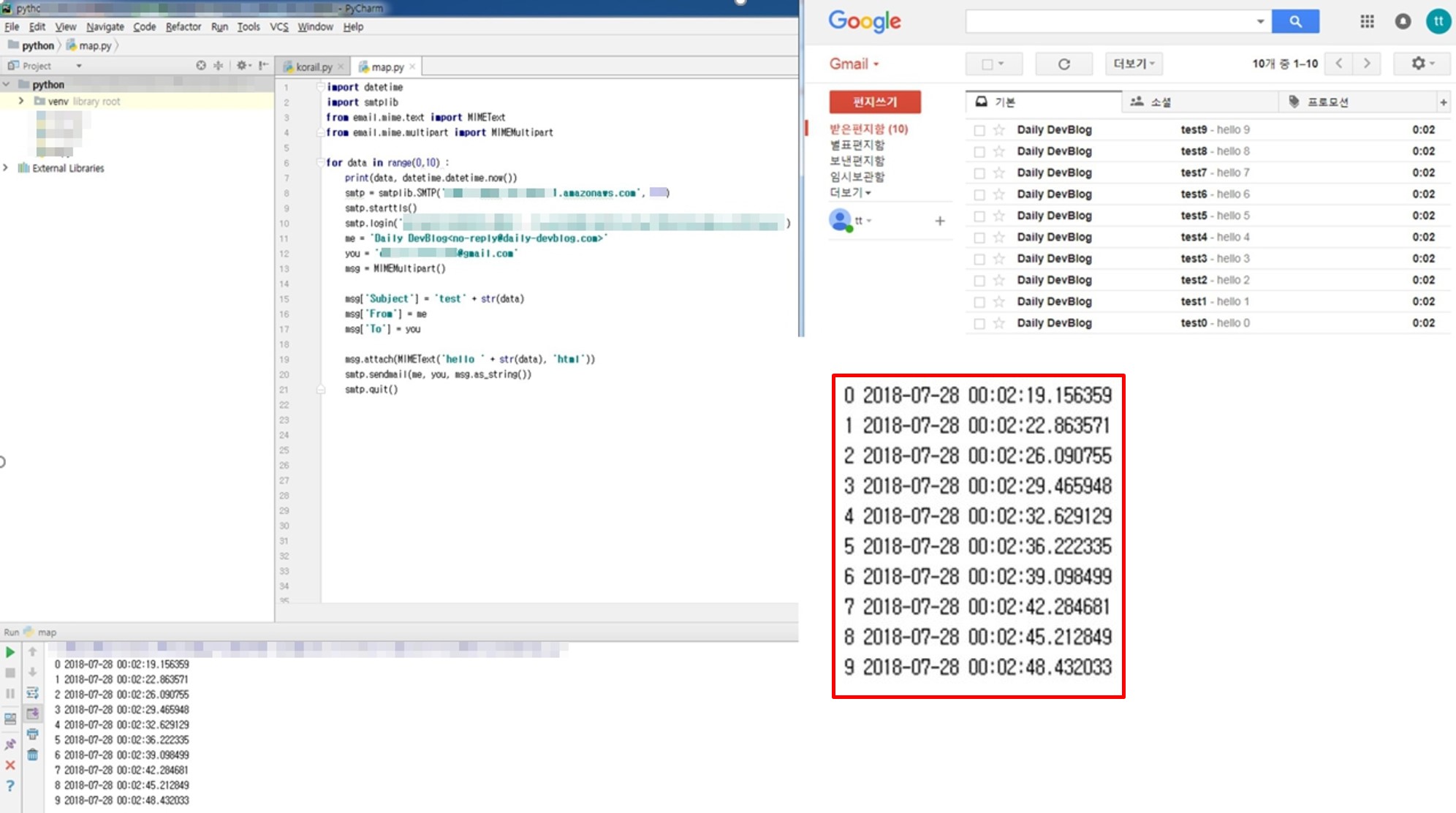 이 문제는 간단히 스레드를 활용해서 해결할수 있었다. 테스트하면서 캡쳐해둔게 있는데 첫번째 스크린샷은 한사람에게 메일을 그냥 10번 반복해서 보냈고 두번째 스크린샷은 스레드를 활용해서 보내보았다. 확실히 스레드를 활용하니 속도가 빠른걸 확인할수 있었다.