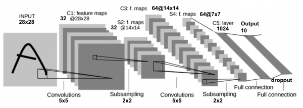 첫 번째 컨볼루션 레이어는 1채널을 가지는 입력 이미지에 대해 5x5 사이즈의 32개의 커널 필터를 적용하여 32개의 특성맵을 생성한다.