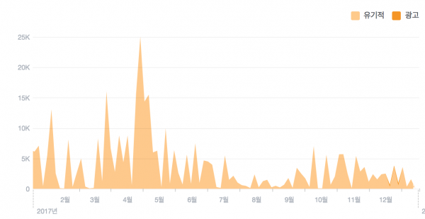 2018년 1월1일 현재 4,635명이 페이지를 좋아요 해주셨습니다. 페이지의 좋아요의 증가는 User View와도 관련이 있는데 3 ~ 5월 증가와 11월 이후 증가가 눈에 띄는데 앞의 User View 트렌드와도 일치하는 것을 볼 수 있습니다.