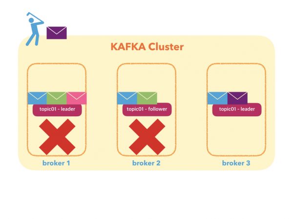 topic01의 경우 ISR 내 더 이상 남아 있는 follower가 없기 때문에 leader를 넘겨줄 수 없는 상황이 되었고, topic01는 leader가 없기 때문에 더 이상 read/write를 할 수 없습니다. 즉, topic01의 경우는 read/write가 불가능한 장애 상황이 된 것입니다. topic02의 경우 topic01과 달리 ISR 내 남아 있는 follower가 하나 있기 때문에 new leader로 변경되고, new leader를 통해 read/write가 가능합니다.