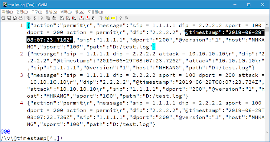 방화벽처럼 key-value 구조가 반복되는 로그의 필드 분류에는 kv 필터가 딱이다. 특히 구분기호로 '='을 사용하는 key-value 구조는 kv {} 구문만으로도 완벽한 테이블 구조를 만들어 줌.