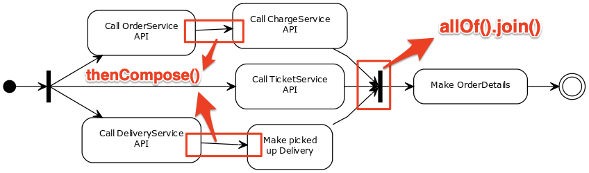 앞서 언급한 주문 상세(OrderDetails) 조립 활동도는 CompletableFuture로 아래와 같이 구현할 수 있다.