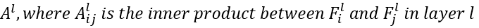 style 특성은 "Texture Synthesis Using Convolutional Neural Networks, Leon A. Gatys"에서 소개한 Gram matrix를 기반으로 한다. style/texture는 공간적인 정보와 무관해야 한다. 그래서 각 레이어의 feature map 사이의 상관관계(correlation)를 나타내는 Gram matrix를 사용한다. 레이어 l에서의 Gram matrix는 아래와 같이 정의된다.