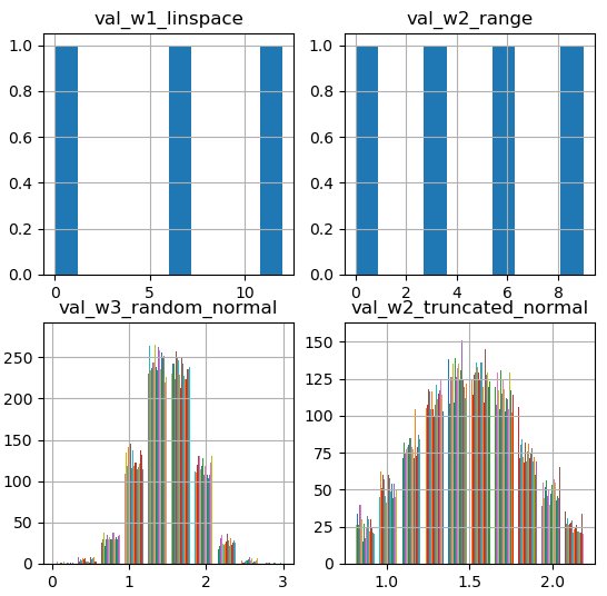 1 2 3 4 5 6 7 8 9 10 11 12 13 14 15 16 17 18 19 20 21 22 23 24 25with tf.Session() as sess: sess.run(init_op) val_b1 = sess.run(bias_1) val_w1, val_w2, val_w3, val_w4 = sess.run([weight_1, weight_2, weight_3, weight_4]) print(type(val_b1)) # >> <type 'numpy.ndarray'> print(val_w1.shape) # >> (3,) # 그래프로 변수 확인하기 plt.subplot(221) plt.hist(val_w1) plt.title('val_w1_linspace') plt.grid(True) plt.subplot(222) plt.hist(val_w2) plt.title('val_w2_range') plt.grid(True) plt.subplot(223) plt.hist(val_w3) plt.title('val_w3_random_normal') plt.grid(True) plt.subplot(224) plt.hist(val_w4) plt.title('val_w2_truncated_normal') plt.grid(True)