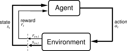 강화학습 알고리즘에서 액션(action)을 수행하는 에이전트(agent)는 어떤 환경(environment)안에 존재한다. 환경은 특정 상태(state)에 있으며, 에이전트가 액션을 수행함으로써 환경은 다른 상태로 전이하며, 특정 경우에 액션은 보상(reward)을 받는다. 그리고 액션은 변경된 상태에서 또다시 다른 액션을 수행하게 된다.