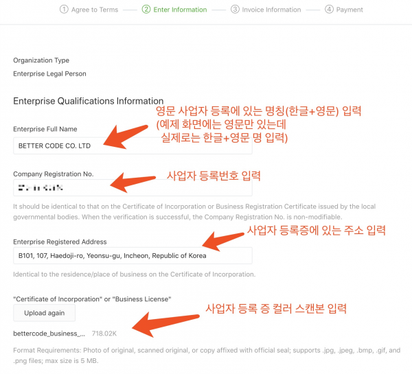 - 회사명: 영문 사업자 등록증에 있는 명칭 그대로 사용(예: 베터코드 주식회사 BETTER CODE CO. LTD.)